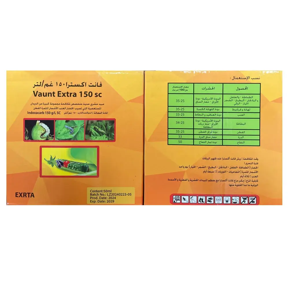 Indoxacarb belongs to the oxadiazine chemical class and is widely recognized for its effectiveness against chewing pests, especially larvae feeding on leaves, stems and fruit tissues. As a 150 g/L SC, the product contains finely milled active ingredient dispersed in water, ensuring easy mixing, strong suspension stability, low odour and excellent compatibility with typical spray equipment.